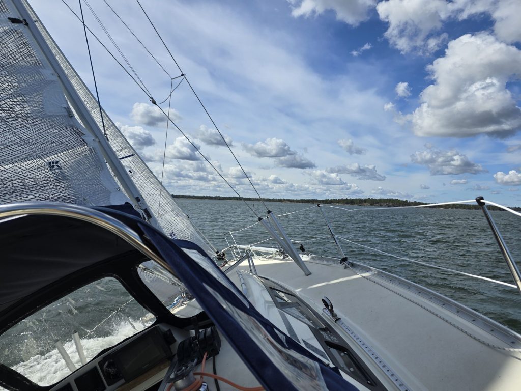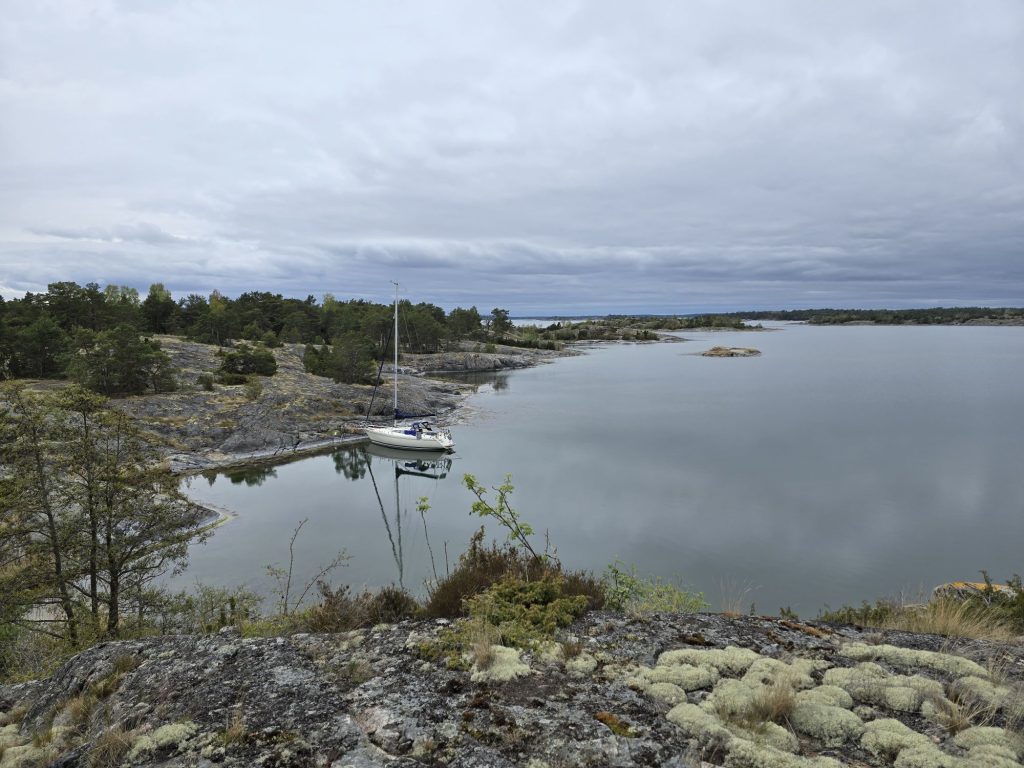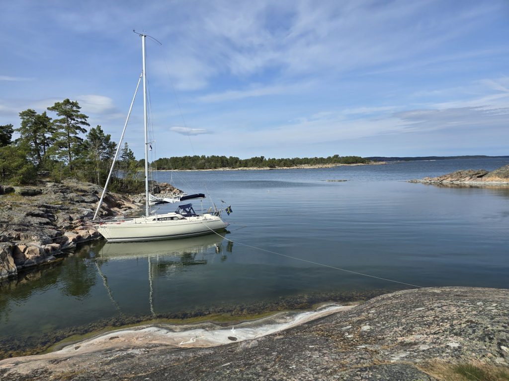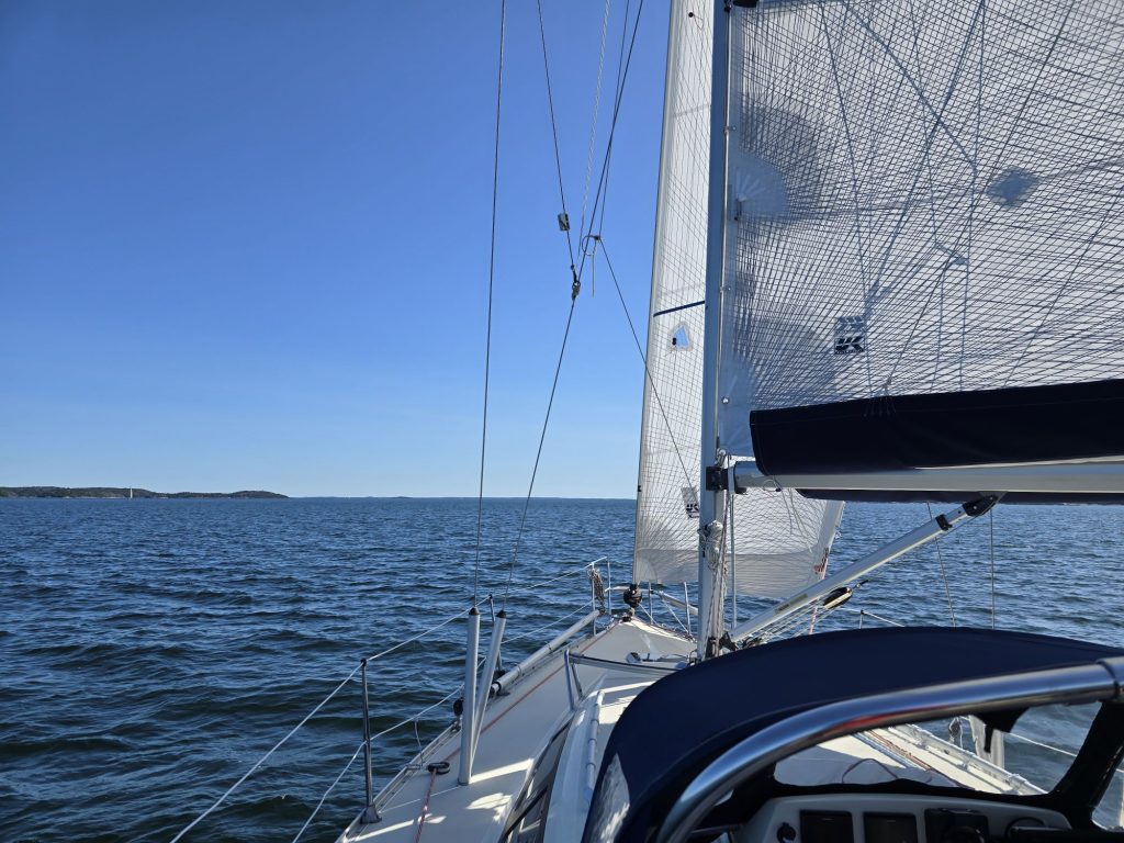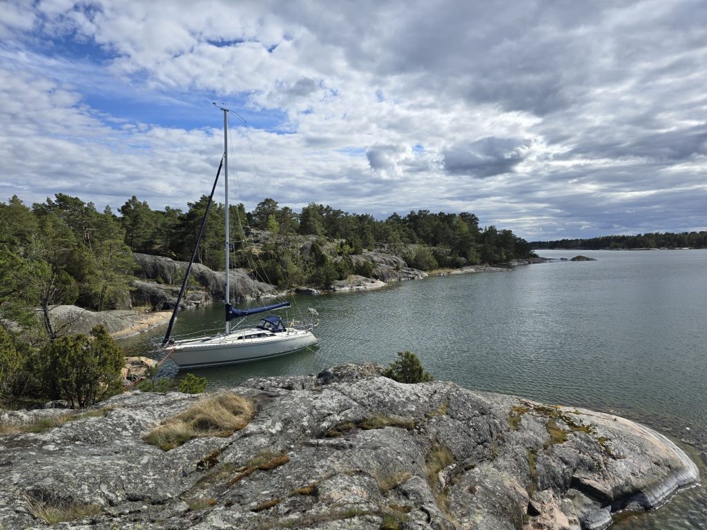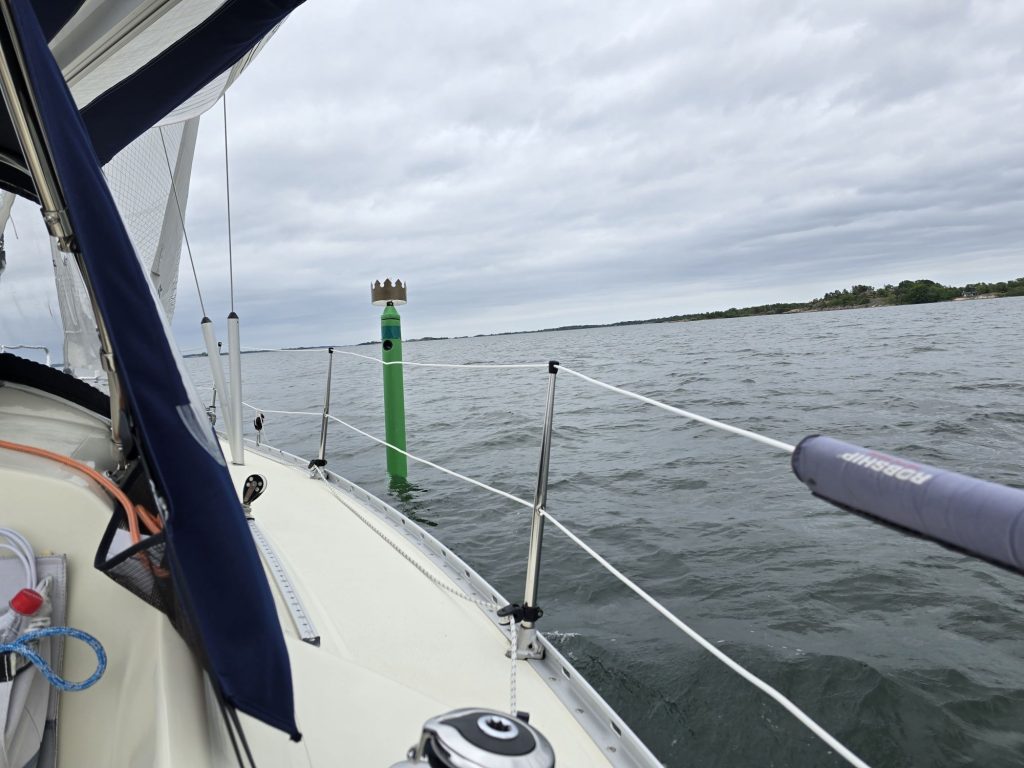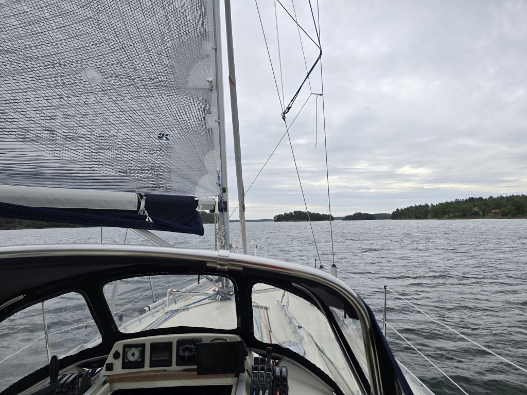 Smågrått och stundtals regn. Började kortbyxat men ganska snart fullt seglarställ och mössa! Läns och räknade med många gippar så satte revad stor från start. Kändes lite onödigt första timmen men snart byggde vinden på. Stort sett ensamma på fjärdarna, såg nog inte 10 båtar denna dag. Lagom förbi Sandhamn över 14ms och riktigt elak sjö. Fick trängas lite med något krigiskt fartyg från USA (USS Mount Whitney) på väg ut eskorterad av ett antal kustbevakande båtar med blåljus. Rullades aldrig ut ngn fock men höll över 6 knop stort sett hela resan, ofta 6,5-7 och toppade nära 9 i någon surf. En fröjd att komma in bland skyddande skär och sällan är det så gott med mat som efter sådana här dagar.