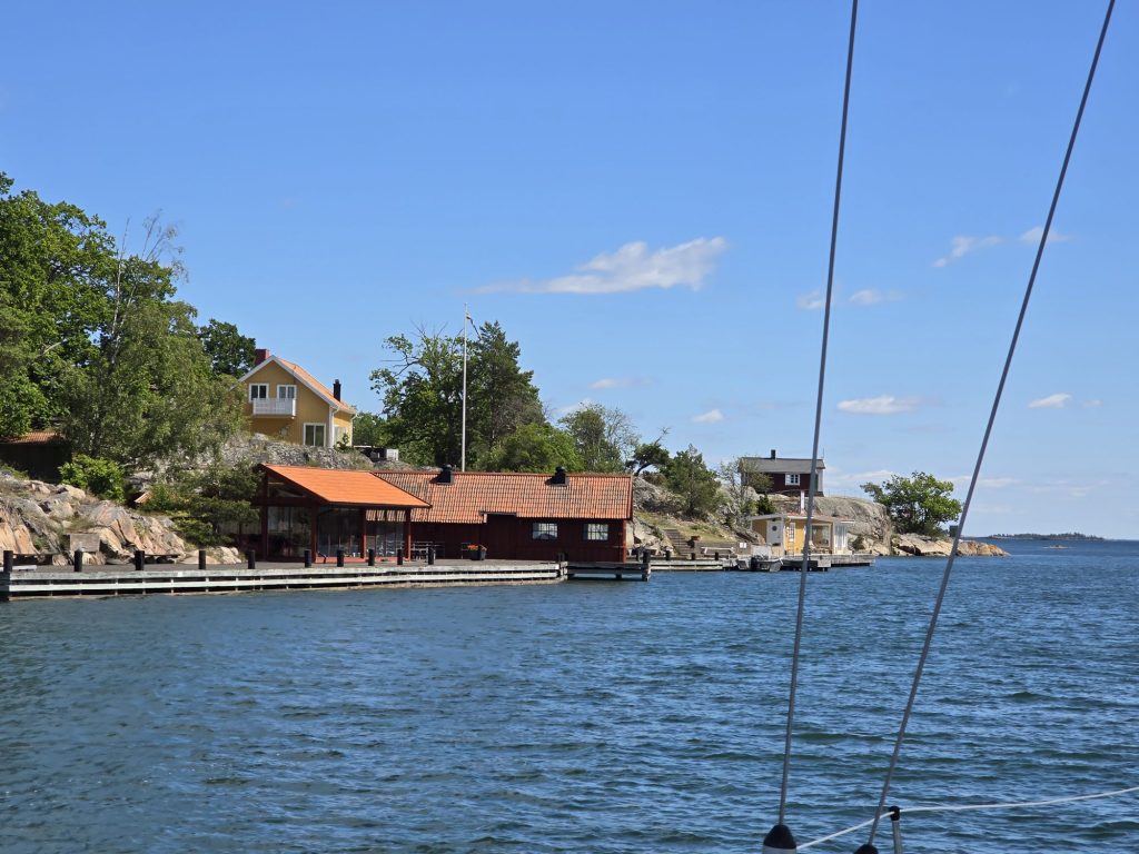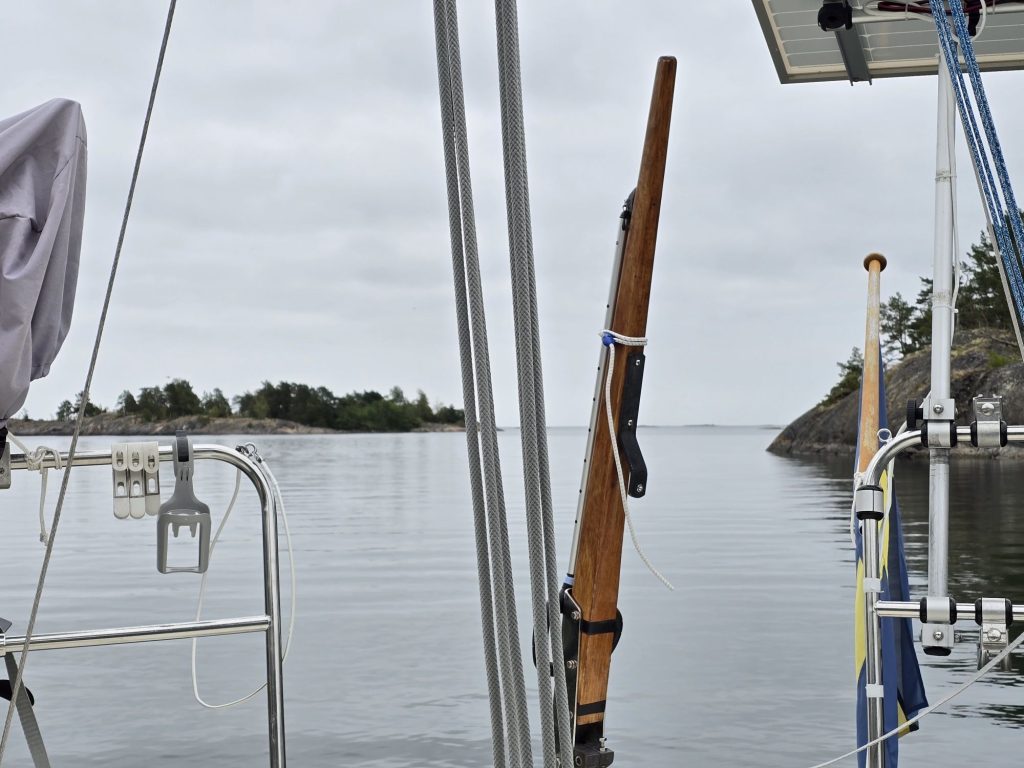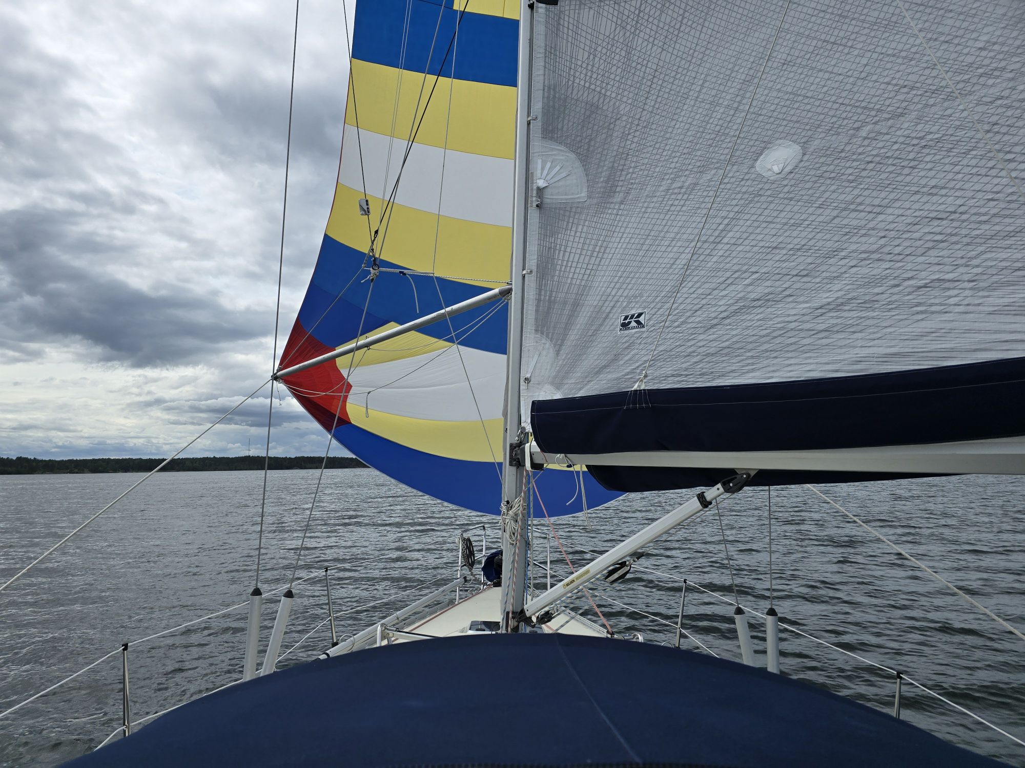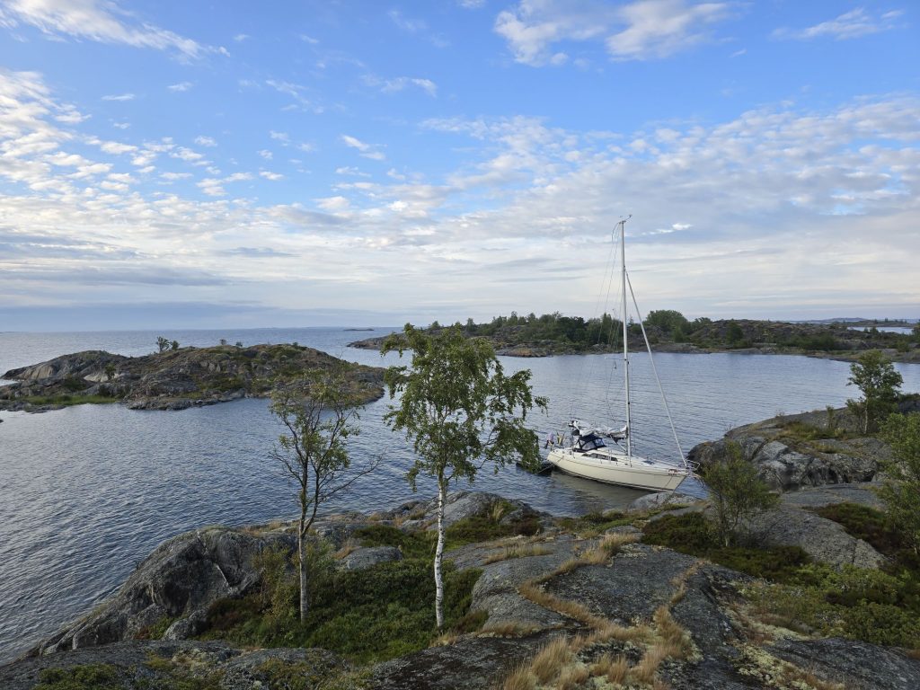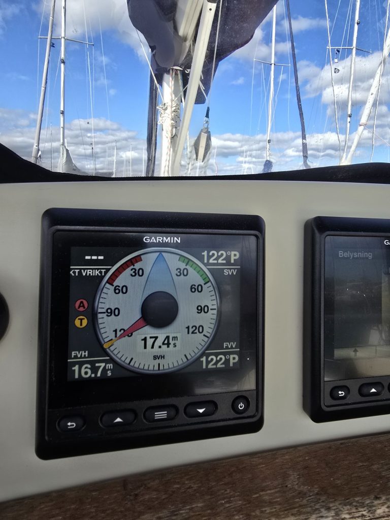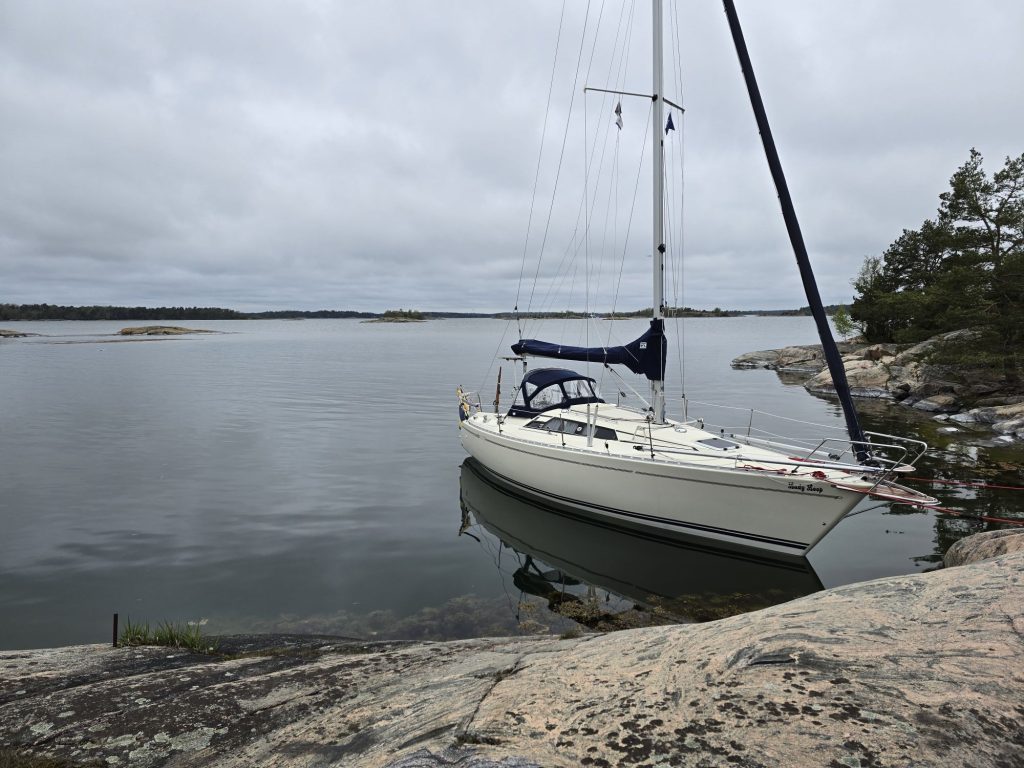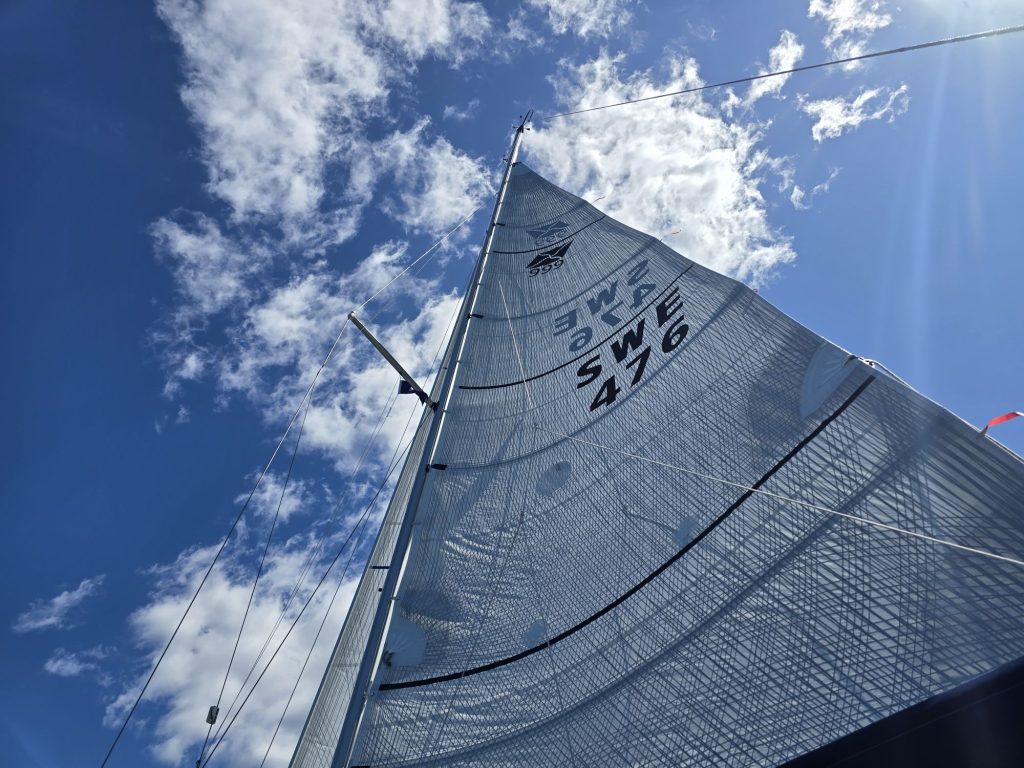 Smågrått och stundtals regn. Började kortbyxat men ganska snart fullt seglarställ och mössa! Läns och räknade med många gippar så satte revad stor från start. Kändes lite onödigt första timmen men snart byggde vinden på. Stort sett ensamma på fjärdarna, såg nog inte 10 båtar denna dag. Lagom förbi Sandhamn över 14ms och riktigt elak sjö. Fick trängas lite med något krigiskt fartyg från USA (USS Mount Whitney) på väg ut eskorterad av ett antal kustbevakande båtar med blåljus. Rullades aldrig ut ngn fock men höll över 6 knop stort sett hela resan, ofta 6,5-7 och toppade nära 9 i någon surf. En fröjd att komma in bland skyddande skär och sällan är det så gott med mat som efter sådana här dagar.