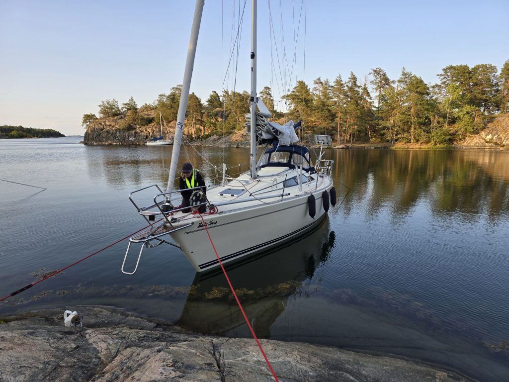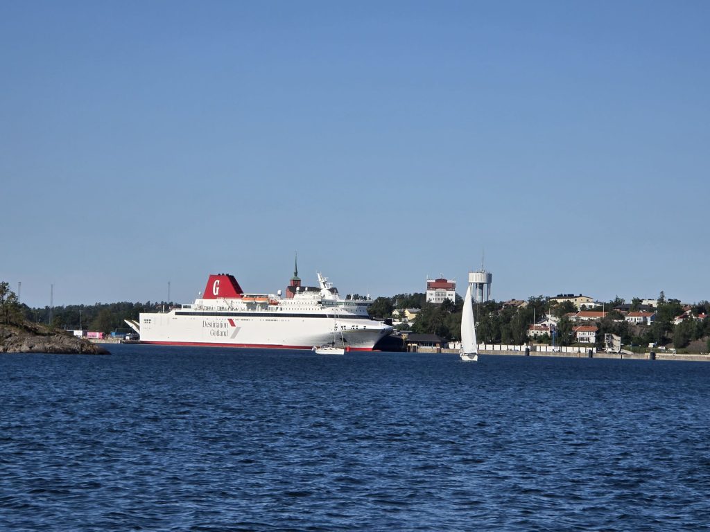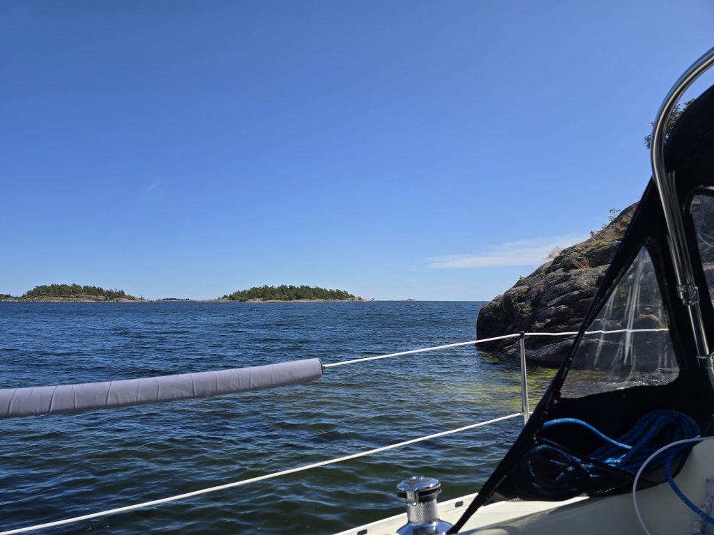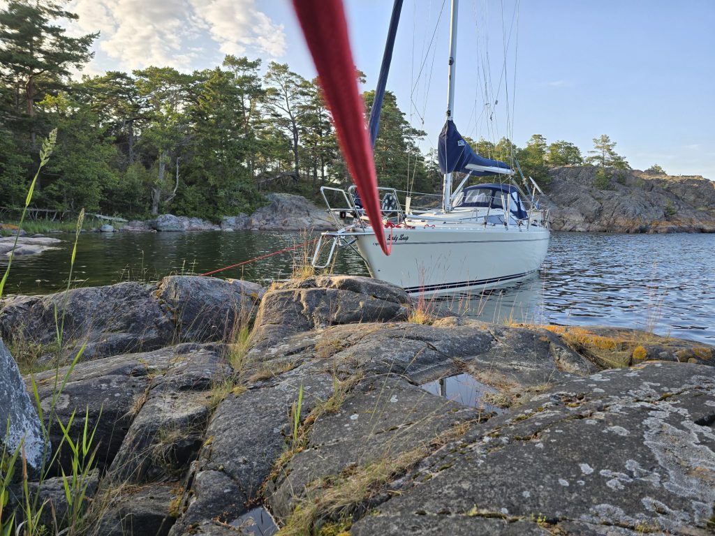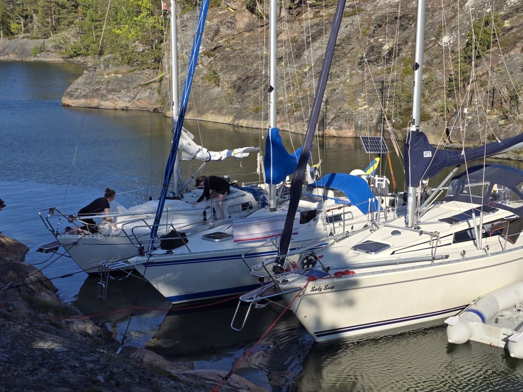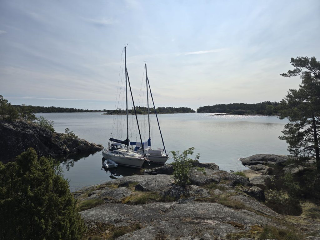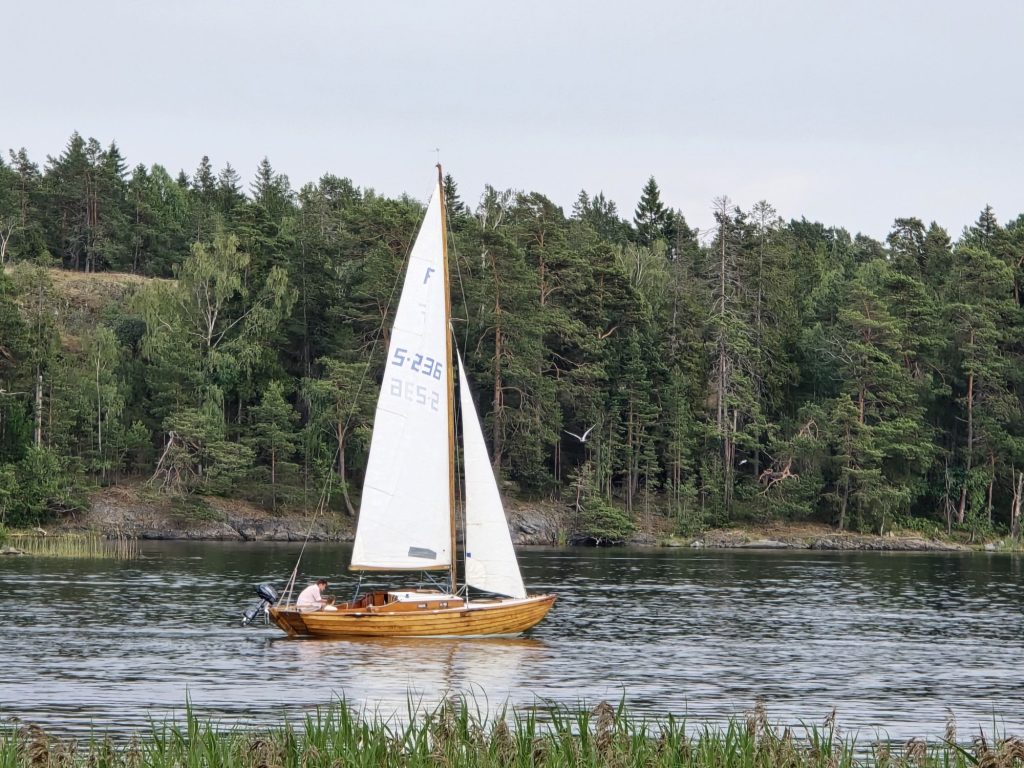 Smågrått och stundtals regn. Började kortbyxat men ganska snart fullt seglarställ och mössa! Läns och räknade med många gippar så satte revad stor från start. Kändes lite onödigt första timmen men snart byggde vinden på. Stort sett ensamma på fjärdarna, såg nog inte 10 båtar denna dag. Lagom förbi Sandhamn över 14ms och riktigt elak sjö. Fick trängas lite med något krigiskt fartyg från USA (USS Mount Whitney) på väg ut eskorterad av ett antal kustbevakande båtar med blåljus. Rullades aldrig ut ngn fock men höll över 6 knop stort sett hela resan, ofta 6,5-7 och toppade nära 9 i någon surf. En fröjd att komma in bland skyddande skär och sällan är det så gott med mat som efter sådana här dagar.