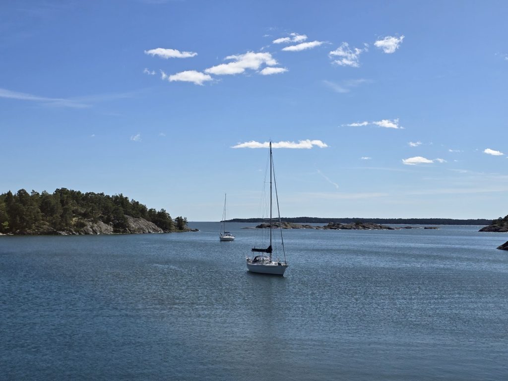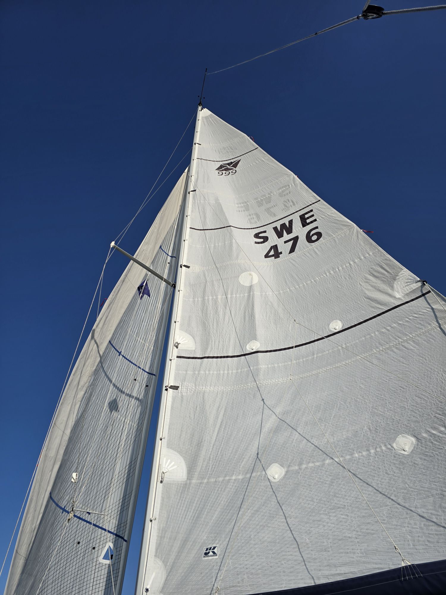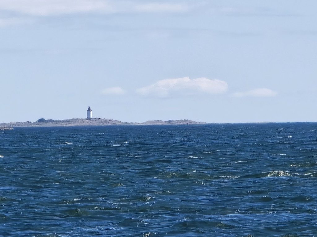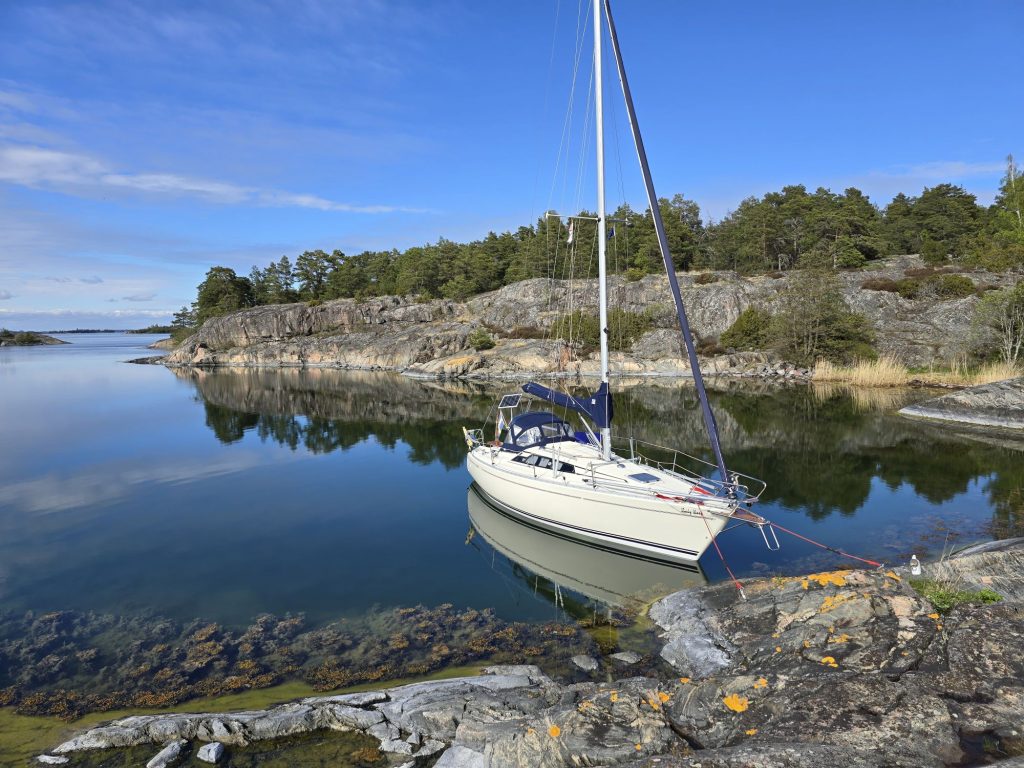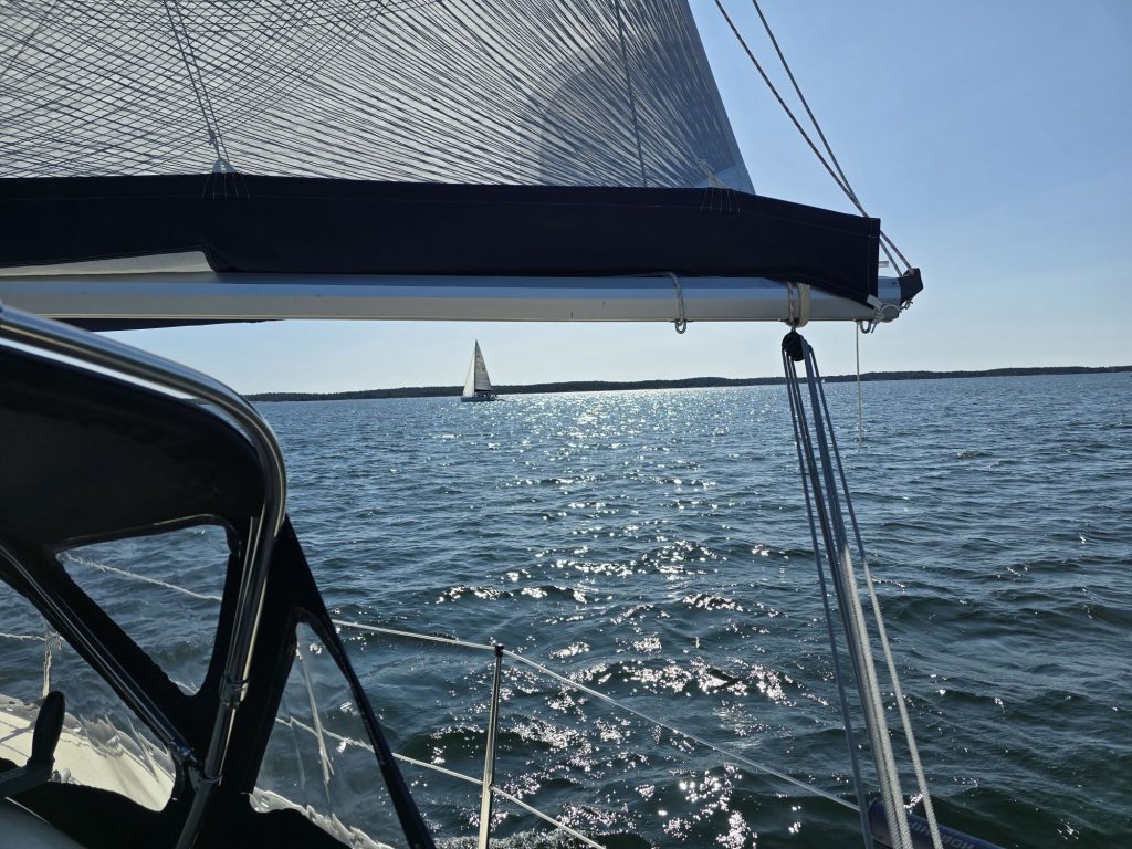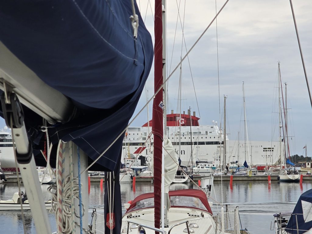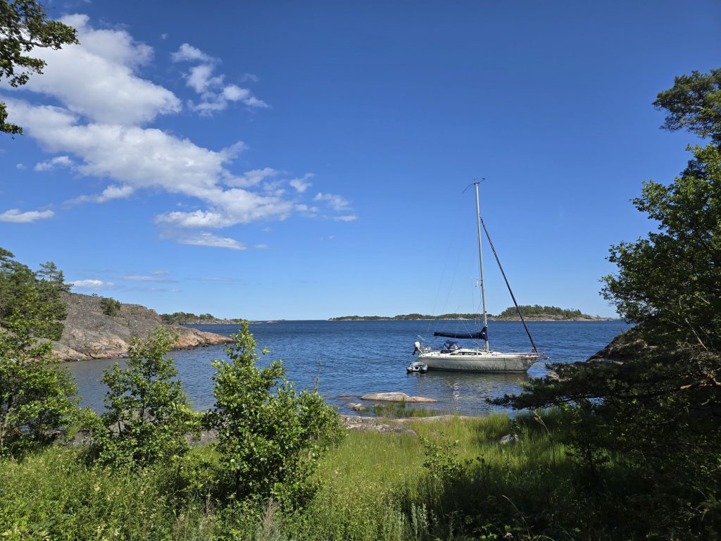 Smågrått och stundtals regn. Började kortbyxat men ganska snart fullt seglarställ och mössa! Läns och räknade med många gippar så satte revad stor från start. Kändes lite onödigt första timmen men snart byggde vinden på. Stort sett ensamma på fjärdarna, såg nog inte 10 båtar denna dag. Lagom förbi Sandhamn över 14ms och riktigt elak sjö. Fick trängas lite med något krigiskt fartyg från USA (USS Mount Whitney) på väg ut eskorterad av ett antal kustbevakande båtar med blåljus. Rullades aldrig ut ngn fock men höll över 6 knop stort sett hela resan, ofta 6,5-7 och toppade nära 9 i någon surf. En fröjd att komma in bland skyddande skär och sällan är det så gott med mat som efter sådana här dagar.