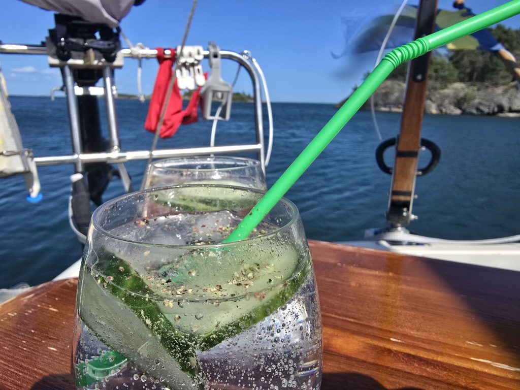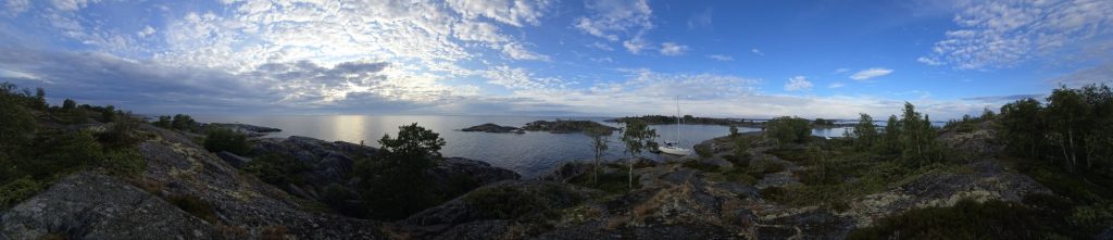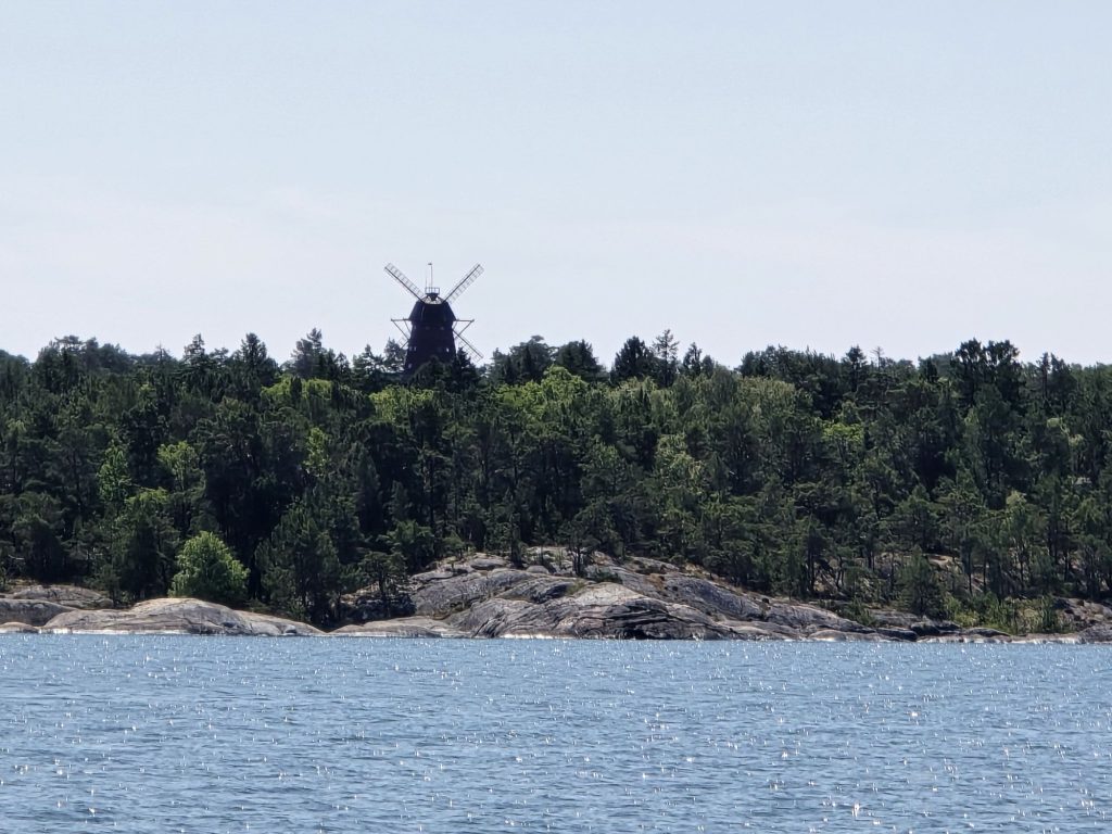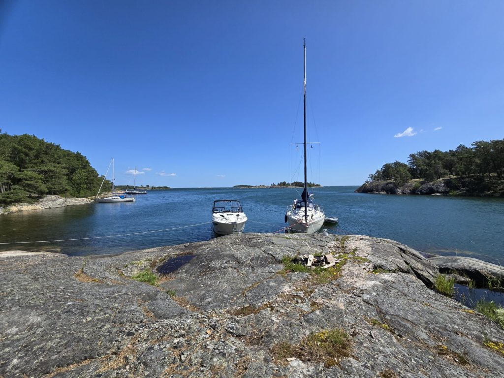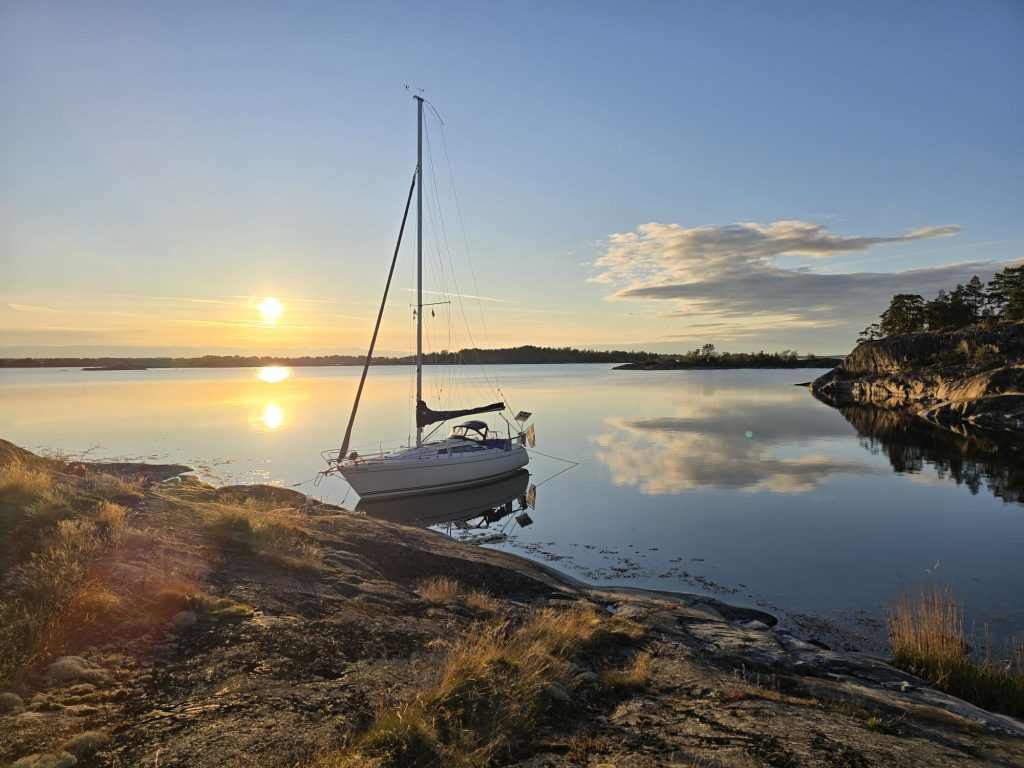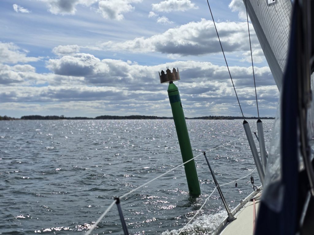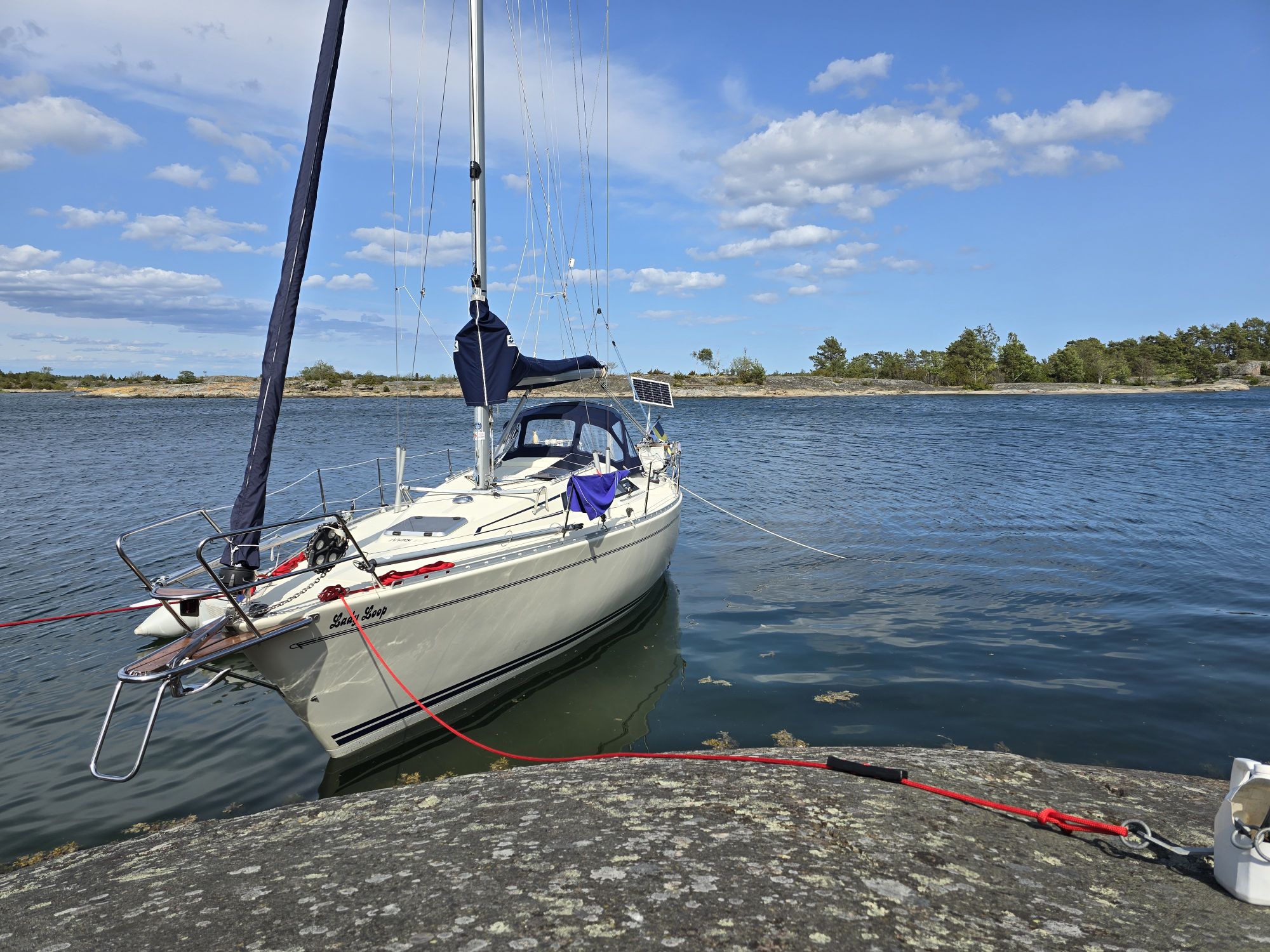 Smågrått och stundtals regn. Började kortbyxat men ganska snart fullt seglarställ och mössa! Läns och räknade med många gippar så satte revad stor från start. Kändes lite onödigt första timmen men snart byggde vinden på. Stort sett ensamma på fjärdarna, såg nog inte 10 båtar denna dag. Lagom förbi Sandhamn över 14ms och riktigt elak sjö. Fick trängas lite med något krigiskt fartyg från USA (USS Mount Whitney) på väg ut eskorterad av ett antal kustbevakande båtar med blåljus. Rullades aldrig ut ngn fock men höll över 6 knop stort sett hela resan, ofta 6,5-7 och toppade nära 9 i någon surf. En fröjd att komma in bland skyddande skär och sällan är det så gott med mat som efter sådana här dagar.