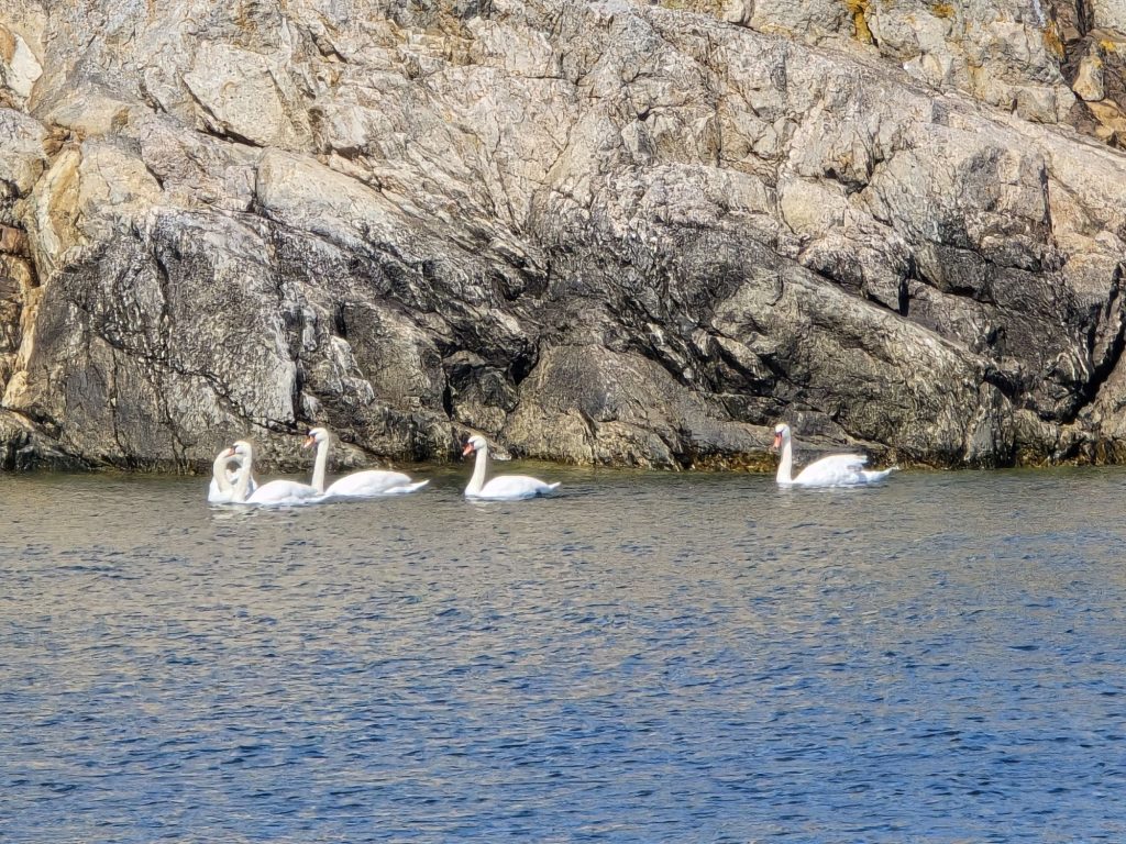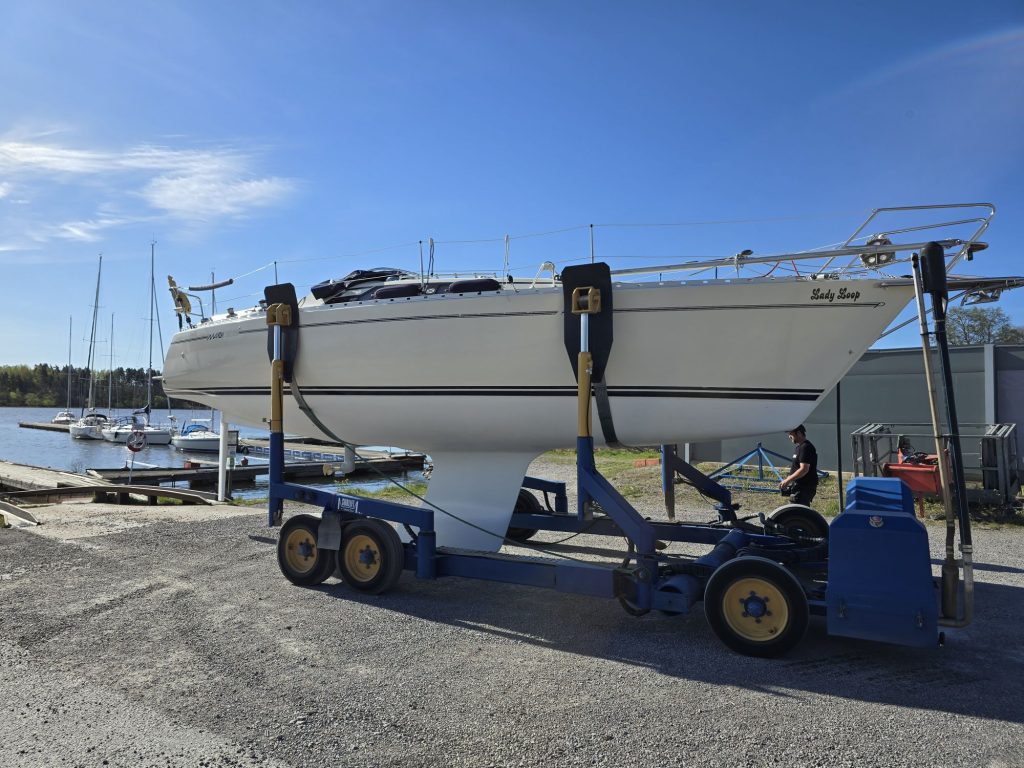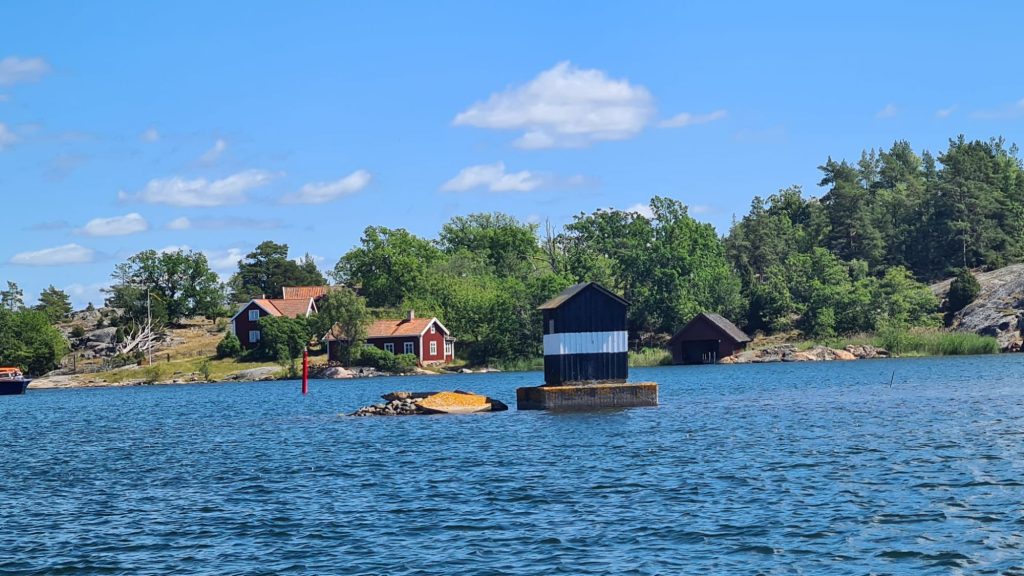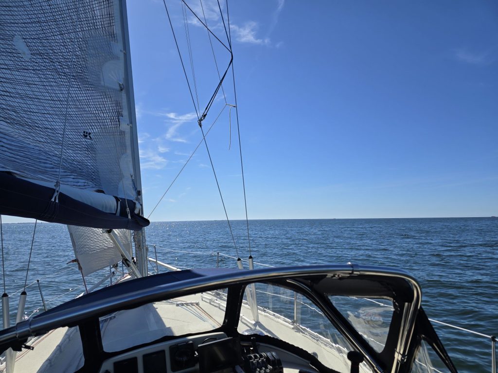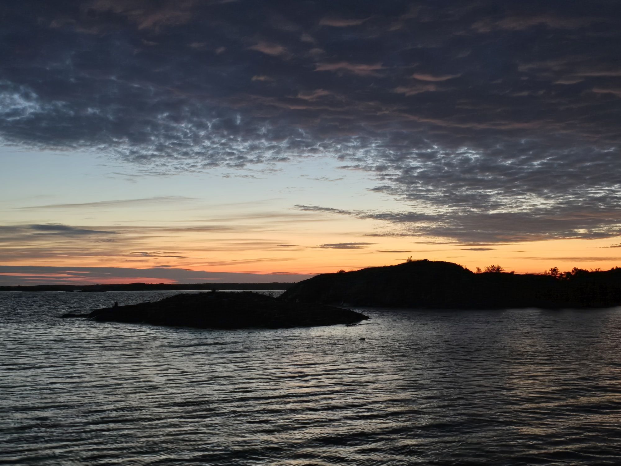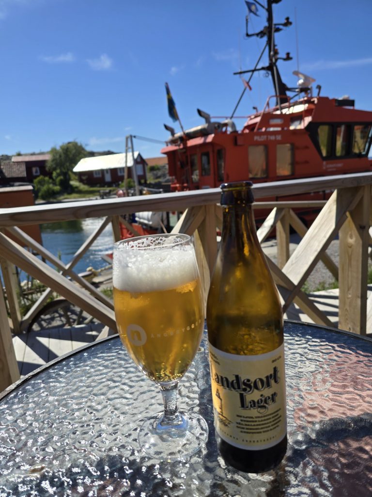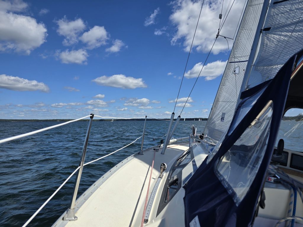 Smågrått och stundtals regn. Började kortbyxat men ganska snart fullt seglarställ och mössa! Läns och räknade med många gippar så satte revad stor från start. Kändes lite onödigt första timmen men snart byggde vinden på. Stort sett ensamma på fjärdarna, såg nog inte 10 båtar denna dag. Lagom förbi Sandhamn över 14ms och riktigt elak sjö. Fick trängas lite med något krigiskt fartyg från USA (USS Mount Whitney) på väg ut eskorterad av ett antal kustbevakande båtar med blåljus. Rullades aldrig ut ngn fock men höll över 6 knop stort sett hela resan, ofta 6,5-7 och toppade nära 9 i någon surf. En fröjd att komma in bland skyddande skär och sällan är det så gott med mat som efter sådana här dagar.