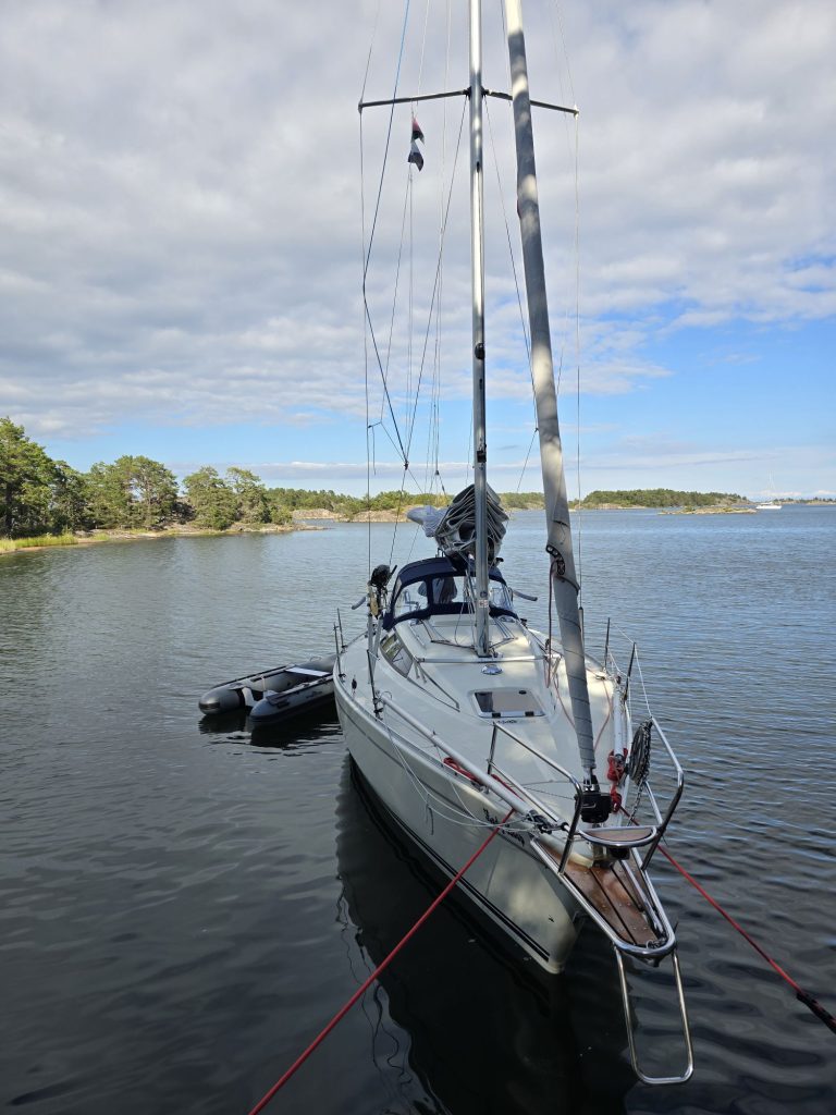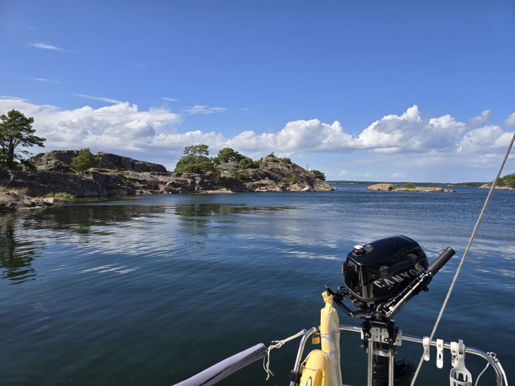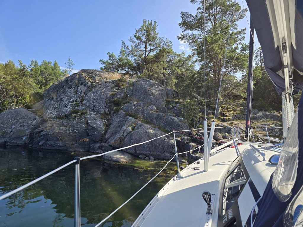 Planen var att gå inre fjärdarna ner not Ornö, kanske hitta något på utsidan av Fjärdlång. Varför inte baksidan Dänholmen eller något däromkring. Blåste en hyfsad nordostvind på bortåt 10-11. Trevlig att segla på men det byggde upp en massa sjö. Även om vi hittade trevliga klippor i lä för vinden så smet vågorna runt och gjorde natthamnarna mindre attraktiva.