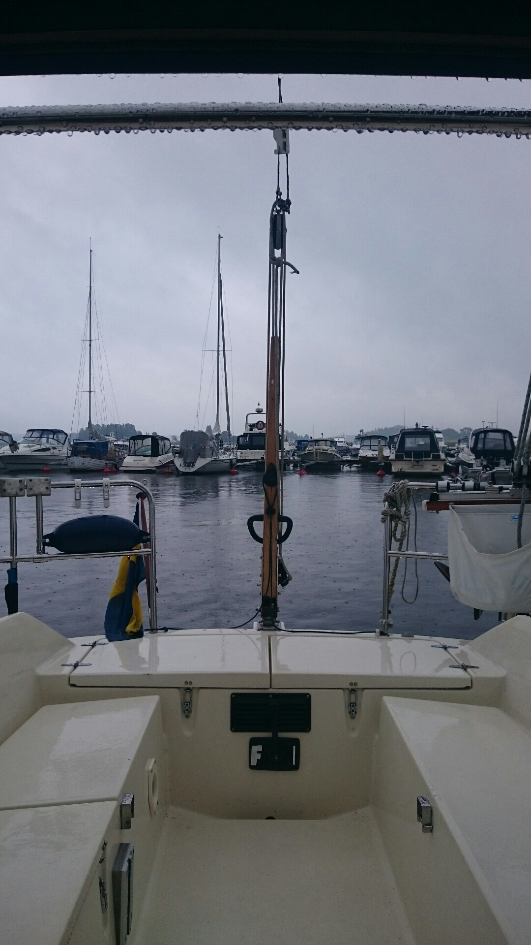 En intensiv dag med slussar, broöppningar och akvedukter. Med lite mer tid, eller mindre längtan till kompisarna i skärgården samt lite bättre väder kanske man kunde stanna lite mer, njuta lite mer och bara ha det allmänt lite bättre lite mer. Nu hade vi lite variation på vädret. Ibland spöregn, ibland bara vanligt regn, ibland mer vattendimma som blöter ner allt. Faktiskt glömde vädret bort sig ibland och regnade inte alls.